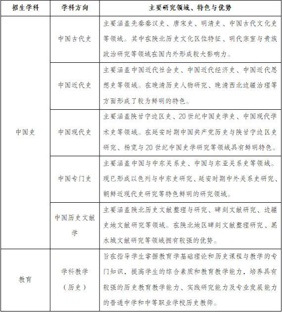 公司现有中国史一级学科硕士学位授权点,下设中国古代史、中国近代史、中国现代史、中国专门史、中国历史文献学5个研究方向。此外还设有学科教学(历史)二级学科专业学位授权点。现有硕士研究生导师29人,其中本院导师26人、外院导师2人、校外兼职导师1人,在校硕士研究生人数124人。学院设有陕北历史文化研究中心(陕西省哲学社会科学重点研究基地)、陕西省人民政协理论与实践研究基地、陕西地区韩国独立运动研究与韩国学教育研究基地等研究平台3个,地方历史文献与文物数字化实验室1个,微格教学实验室1个,资料室1间(中、外文期刊80多种,藏书共计10万余册)。